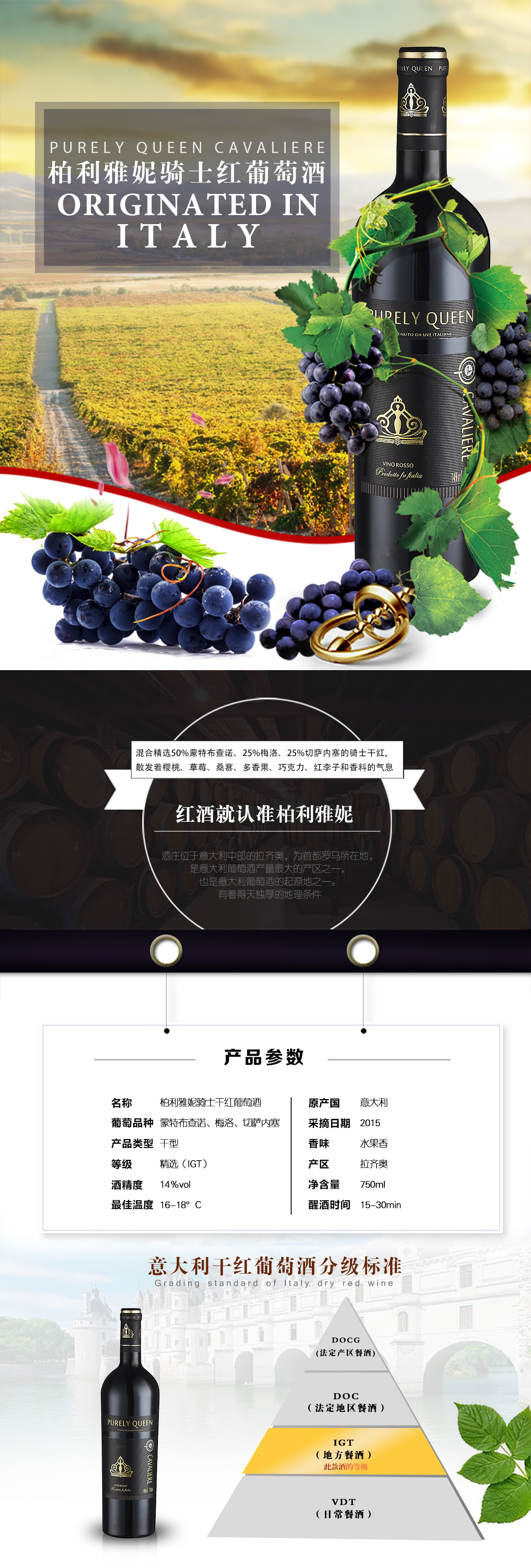 柏利雅妮骑士干红源自意大利中部拉齐奥,为首都罗马所在地,IGT精选等级。由蒙特布查诺、美乐、切萨内塞等葡萄品种混酿而成。可与大多数肉类,也可大胆尝试配搭火锅、实感酒酵餐类等食物。