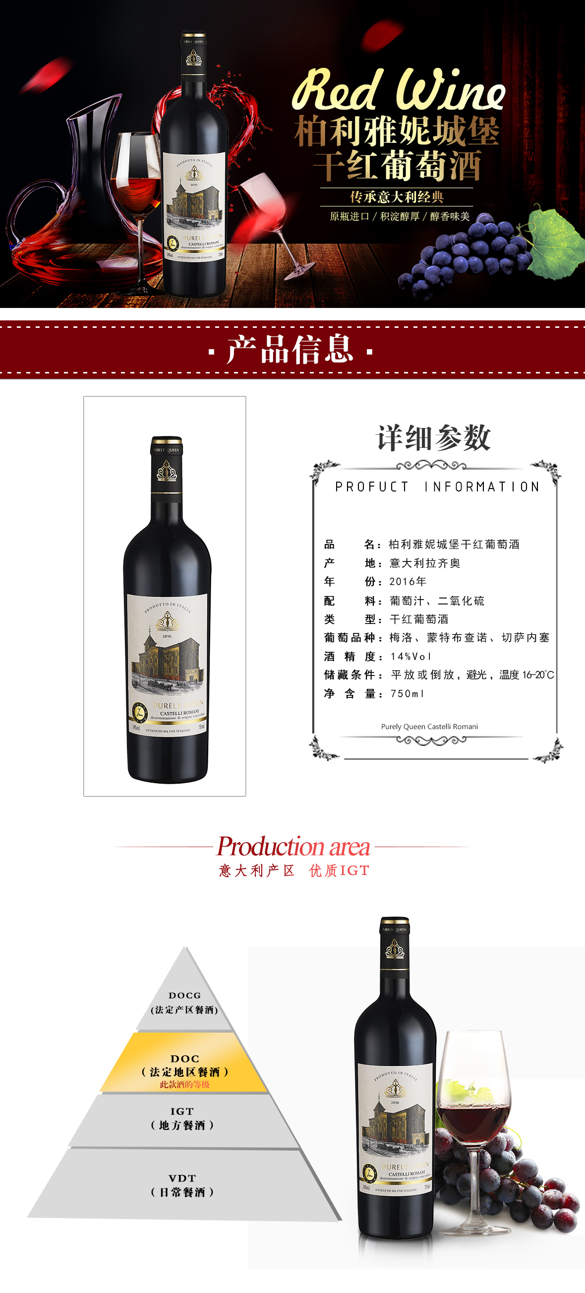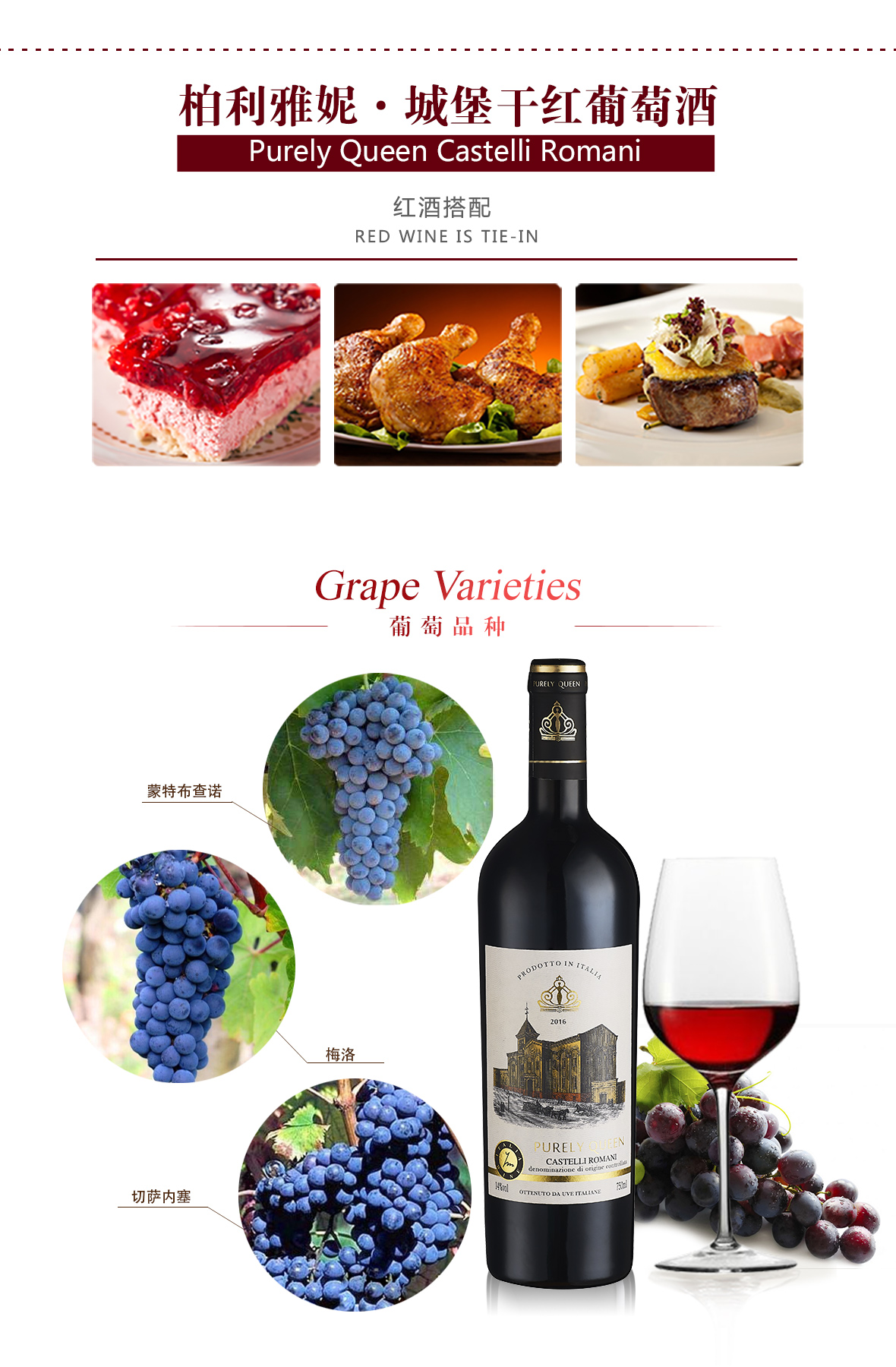 柏利雅妮城堡干红源自意大利葡萄酒起源地之一的拉齐奥城堡酒庄,DOC等级。由蒙特布查诺、梅洛、切萨内塞等葡萄品种混酿而成,可搭配禽肉、牛肉、猪肉、烤肉、欧餐及干酪等多种食物。